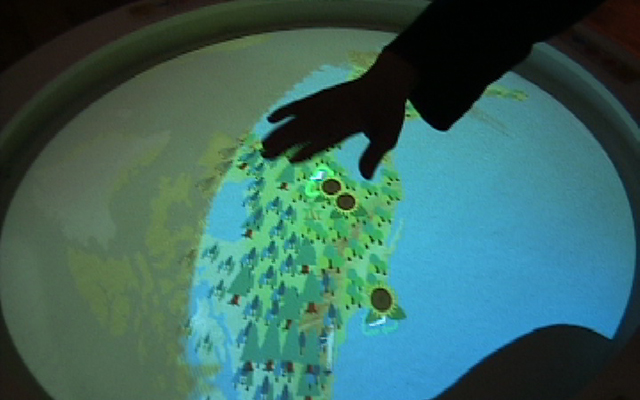 様々な環境問題によって、刻一刻と悪化していく3つの地球に観客が手をかざすことで、地球が浄化されるイメージを共有する。
